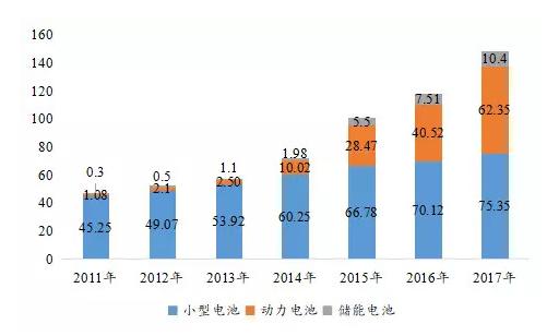 2011-2017年全球不同类型锂电池出货量(单位:GWh)