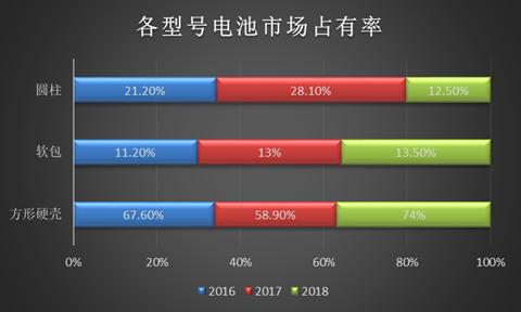 比较分析三种动力电池形态细分市场,市场格局表现出现分化。2016-2018 年整个动力电池市场出货量65GWh,年均复合增长率超过 40%。其中圆柱电池的出货量为 7.1GWh,市场份额下降到 12.5%,同比下降 30.2%,圆柱电池的市场份额逐渐萎缩,三年时间大约缩减了一半,出货量和市场占有率萎缩至倒数第一;软包动力电池出货量增长率超过市场平均增速,达到了 50%以上,软包动力电池 2018 年出货量已经达到7.6GWh,软包市场份额保持坚挺,而且稳中有升,居于第二的位置,表现出强劲的后发优势。究其原因是软包具有最高的能量密度,相对较低的 PACK 的成本优势,未来有进一步抢占市场的潜力,具有黑马特质。