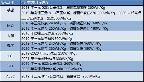 主流软包电池企业单体能量密度进阶之路。业内企业推出的量产软包产品,2016年行业平均水平在 200-210Wh/Kg, 2018 年电池企业软包能量密度达到 260Wh/Kg,到 2019 年,企业已经开发出 300Wh/Kg 的软包电池。目前,国内外软包企业纷纷布局高能量密度软包电池,以满足未来新能车市场的需求。
