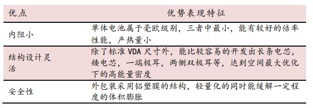 软包电池有能量密度最高的优势,因此超高能量密度电池单体的解决方案都会选择软包技术。最近国家科技部公布新能源汽车重点专项项目,其中有一项关键技术指标要求电池单体能量密度达到 300Wh/Kg。宁德时代“新一代锂离子动力电池产业化技术开发”和天津力神“高比能量动力锂离子电池开发与产业化技术攻关”项目均有入围,其中天津力神研发的软包电池能量密度可达303Wh/Kg。在国家科技部重大专项“高比能量动力锂电池的研发与集成应用”项目中,国轩高科生产的三元 811 软包样品通过科技部中期检验,其能量密度达到了 302Wh/Kg。三家承担新型锂离子电池项目的企业,都选择了三元软包电池技术路线,来实现单体能量密度超过 300Wh/Kg 的目标。国家 863 计划节能与新能源汽车重大项目组组长欧阳明高点评结论,宁德时代三元软包电池在性能和安全各项指标完全满足国标要求。可以看到,技术端电池结构采用软包结构是实现高能量密度的有效路径。另外,包动力电池除了结构重量轻,能量密度高等显著优点以外,还具有方形硬壳和圆柱不具备的其他众多优势