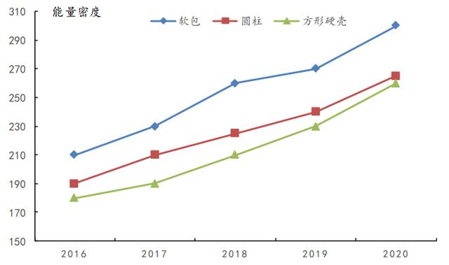 目前能量密度最高的电池单体为软包动力电池,现在行业技术水平软包动力电池单体平均在 260 Wh/Kg,而现在的圆柱和方形硬壳电池单体平均水平只能做到 210 Wh/Kg 和 190 Wh/Kg,远落后于软包电池。相同容量的电池,软包的整体质量要比圆柱轻 20%,比方形硬壳轻 30%以上,因此在能量密度方面,软包动力电池具有绝对领先优势。根据电池产业技术现状及未来发展趋势,比较三种电池单体形态的能量密度及未来发展规划,同期软包能量最高并遥遥领先。