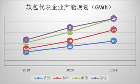 2018 年,软包动力电池行业十分活跃,各大企业纷纷加大投资力度,布局谋篇,抢占先机。6 月,亿纬锂能投资成立软包动力电池公司亿纬集能,规划产能 2020年到 14GWh;7 月,LG Chem 投资 20 亿美金在江苏南京建设新厂,计划到 2023年在中国软包总产能 40GWh;同期,孚能科技在镇江投资建设工厂两期总产能20GWh;8 月,远景(参数|图片)能源收购日本 AESC,在无锡建设新厂,预期产能 20GWh;11月,捷威动力在嘉兴建设软包生产基地,2019 年产能达 6.5GWh,2020 年增至18.5GWh ,恒大健康收购卡耐性能源又提高了软包行业的热度。根据公开信息整理,2020 年国内软包电池企业布局的产能将超过 100GWh。