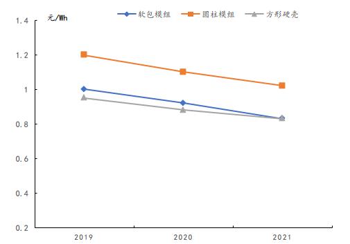 电池成本占新能车整车成本约 40%以上,电池成本直接影响整车成本。在三种形态电池中,成本因素也是影响软包、圆柱和方形硬壳市场占有率的关键要素。当前环境下,新能车整车带电量逐年提高,预计 2019 平均带电量将超过 40KWh,补贴退坡加速,车企成本压力显著增加。按目前的原材料成本发展趋势来看,三种形态的电芯模组价格会下降,2019 年三种电池组成的模组的价格在 1 元/Wh 左右。三种电芯模组中,圆柱电池模组生产工艺最为复杂,需要 7000 多颗电池串并联组成,生产效率低下,成本高企,预计到 2021 年之前其模组价格都会高于 1 元/Wh,超过了方形硬壳和软包模组;方形硬壳全年的出货量超过 50GWh,约是软包和圆柱出货量的 6 倍,其制造工艺相对成熟,电芯连续性卷绕流程,生产效率大大提高,规模化效应有效摊薄成本,成本价格目前最低。软包动力电池还处于市场早期,整体出货量小,厂商释放产能较小,成本偏高,规模效应未体现,近两年成本比方形硬壳略高,随着出货量增加,规模化效应会有效降低成本,进一步缩小与方形硬壳的价格差距。到 2021两者成本差距进一步缩小,模组价格基本一致。